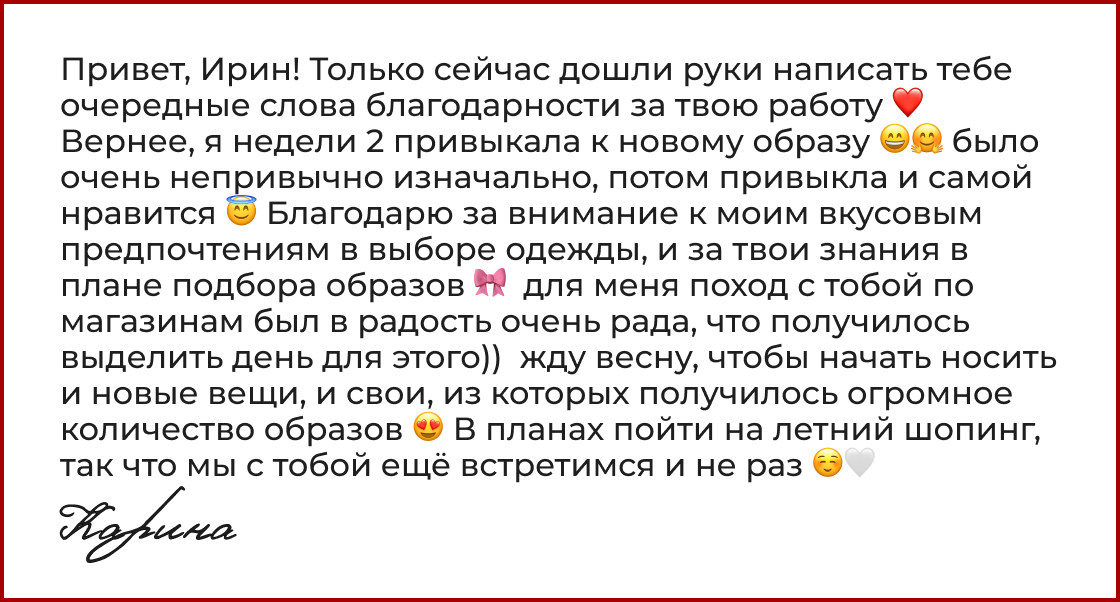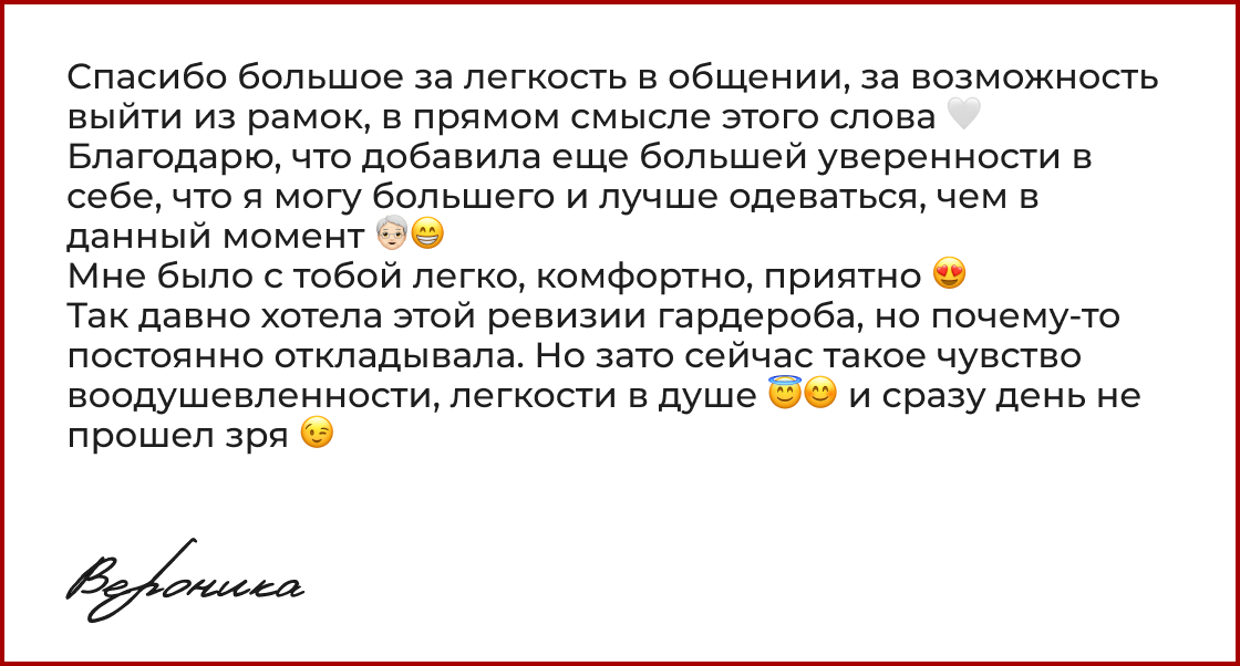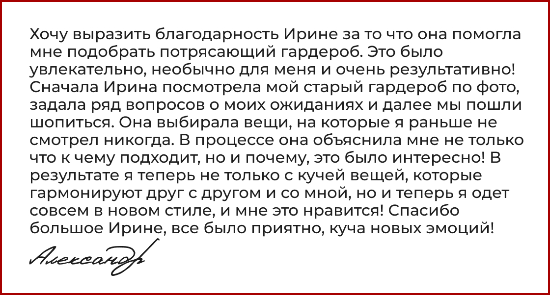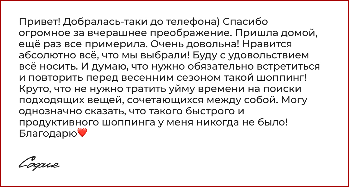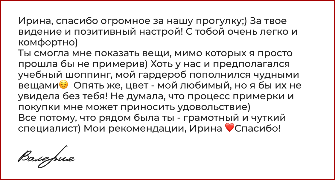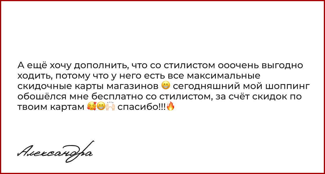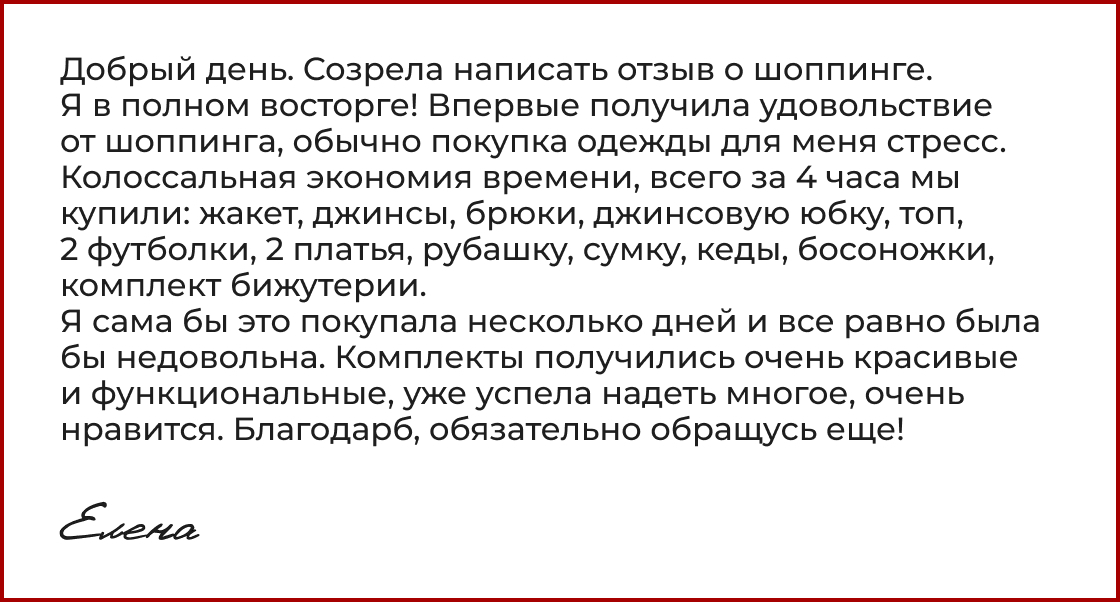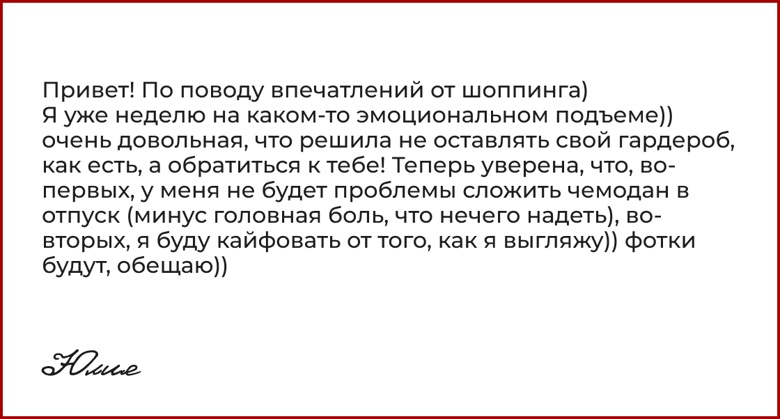Предварительно мы знакомимся и выясняем Ваши гардеробные потребности. Я задаю ряд вопросов о Вашем гардеробе сейчас. Выясняю Ваши пожелания, мы вместе составляем шопинг-лист, назначаем дату шопинга.
